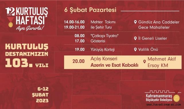 Kahramanmaraş’ın düşman işgalinden kurtuluşunun 103. yıl dönümü kapsamında düzenlenecek Kurtuluş Haftası kutlamaları 6 Şubat Pazartesi günü düzenlenecek çeşitli etkinliklerle start alacak. Kurtuluş Haftası kutlamalarının ilk gününde, Maraş’ın Milli Mücadelesini konu alan ‘Çatkapı Tiyatro’ adlı gösteri liselerde öğrencilerle buluşacak. Mehter Takımı da gün içerisinde üstü açık otobüs ile ana caddeler ve mahalleleri ziyaret ederek Kahramanmaraşlıları kutlama törenlerine davet edecek.