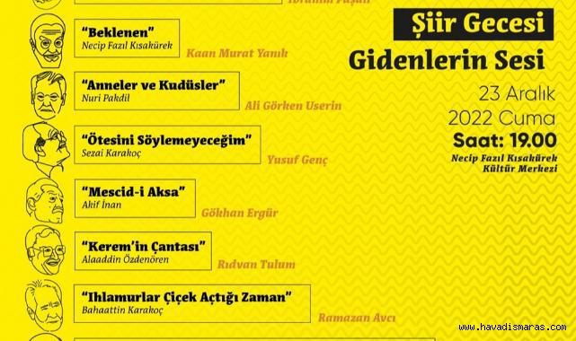 Saat 19.00’da başlayacak şiir dinletisinde; Abdurrahim Karakoç, Mevlâna İdris, Necip Fazıl Kısakürek, Nuri Pakdil, Sezai Karakoç, Akif İnan, Alaaddin Özdenören, Bahaattin Karakoç, Erdem Beyazıt ve Cahit Zarifoğlu’nun birbirinden değerli eserleri edebiyatseverler için seslendirilecek. Programın devamında ise, ses ve tanbur sanatçısı Hakan Dedeler sahne alacak.
