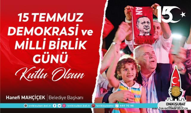 15 Temmuz Demokrasi ve Milli Birlik Günü dolayısıyla mesaj yayımlayan Onikişubat Belediye Başkanı Hanefi Mahçiçek, “15 Temmuz 2016 gecesi, Başkomutanımız ve Cumhurbaşkanımız Recep Tayyip Erdoğan’ın riyasetinde, aziz milletimizin ve kahraman güvenlik güçlerimizin onurlu duruşuyla tarihimizin en büyük destanlarından biri olarak hafızalara kazınmıştır. Biz; ‘Türkiye Aşkına’ diyerek dün olduğu gibi bugün de darbecilere ve hainlere geçit vermedik, vermeyeceğiz. Destansı vatan savunmasının yıl dönümünde şehitlerimizi rahmet ve minnetle yâd ediyor, gazilerimize sağlık ve sıhhat diliyorum” dedi.