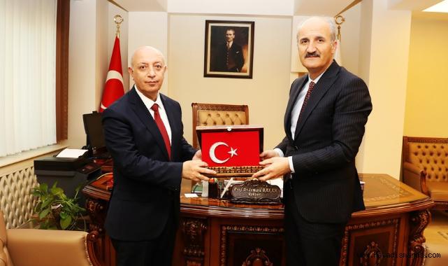 Başkan Okay, ziyaretin anısına Rektör Bakan’a, Kahramanmaraş’a özgü ceviz oyma sandık içerisinde Türk Bayrağı takdim etti.