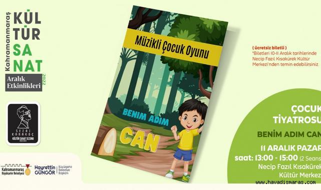 Sezai Karakoç Kültür Sanat Sezonu’nda çocuklar için de çeşitli etkinlikler düzenleyen Büyükşehir Belediyesi, 11 Aralık Pazar günü ‘Benim Adım Can’ adlı müzikli tiyatro gösterisini miniklerle buluşturacak. Necip Fazıl Kısakürek Kültür Merkezi’nde sahnelenecek tiyatro gösterisi, saat 13.00 ve 15.00’da minikler için perdelerini açacak. Oldukça iyi niyetli bir çocuk olan Can’ın başından geçen maceraları ve deneyim kazanmak için gittiği yeni yerlerde karşılaştığı olayları konu alan gösterinin biletleri, 10 ve 11 Aralık tarihlerinde Necip Fazıl Kısakürek Kültür Merkezi’nden temin edilebilecek.