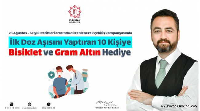 Elbistan’da Covid-19’la mücadele kapsamında 23 Ağustos-6 Eylül tarihleri arasında düzenlenecek kampanya ile ilk doz aşısını yaptıranlar arasından 10 kişiye çekilişle bisiklet ve gram altın hediye edilecek.