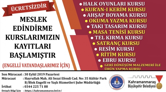 Engelli vatandaşların el becerilerini geliştirirken aynı zamanda sosyal yaşamlarına da katkı sağlama amacıyla düzenlenen kurslarda; Halk Oyunları, Kur’an-ı Kerim, Ahşap Boyama, Okuma-Yazma, Takı Tasarım, Masa Tenisi, Tel Kırma, Satranç, Resim, Ritim, Ebru ve Geri Dönüşüm Malzemeleri ile Ürün Yapma branşlarında eğitim verilecek. 30 Eylül’e kadar Kültürpark’ta bulunan Engelli ve Yaşlı Hizmetleri Şube Müdürlüğü’nde kayıt yaptırılabilecek.