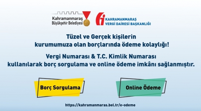 Kahramanmaraş Büyükşehir Belediyesi resmi web sitesi üzerinden borç sorgulamak veya borç ödemek isteyenler: https://kahramanmaras.bel.tr/e-odeme linkinden faydalanabiliyorlar.