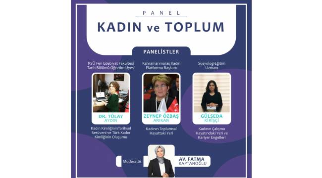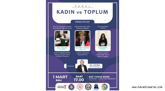 Kahramanmaraş Büyükşehir Belediyesi ve Sütçü İmam Üniversitesi iş birliğiyle 8 Mart Dünya Kadınlar Günü dolayısıyla ‘Kadın ve Toplum’ adlı panel düzenlenecek. KSÜ Yunus Emre Kongre ve Kültür Merkezi’nde düzenlenecek etkinlik saat 17.00’da başlayacak.