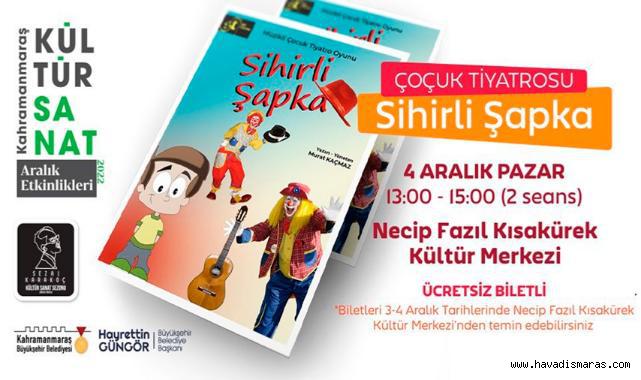 Etkinlik takvimi kapsamında, 4 Aralık Pazar günü Sihirli Şapka adlı müzikli tiyatro gösterisi Necip Fazıl Kısakürek Kültür Merkezi’nde çocuklar için perdelerini açacak. İyilik ve dürüstlüğü ön plana çıkaran, çocukların iyi alışkanlıklar edinmesine yardımcı olmayı hedefleyen tiyatro gösterisi, saat 13.00 ve 15.00 olmak üzere 2 seans şeklinde miniklerle buluşacak.