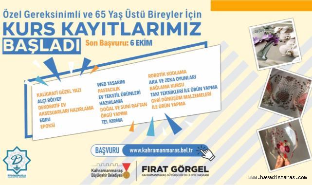 Kurslara katılmak isteyen özel gereksinimli bireyler ve 65 yaş üzeri vatandaşlar, 6 Ekim tarihine kadar çevrimiçi başvuru yapabilecek. Başvurular, https://kahramanmaras.bel.tr/duyuru/2025/09/25/ozel-gereksinimli-ve-65-yas-ustu-vatandaslar-icin-kurs-kayitlari internet adresinden alınıyor.