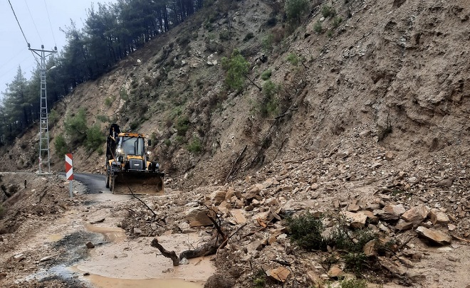 Yağışlarla birlikte yüksek kesimlerden arterlere taşınan çamur yığınları, taş parçaları ve kayalar da iş makineleriyle titizlikle temizleniyor.