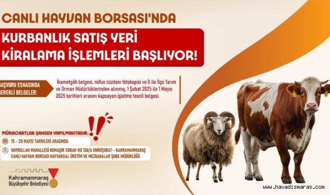 Kahramanmaraş Büyükşehir Belediyesi, yaklaşan Kurban Bayramı öncesi hazırlıklarını sürdürüyor. Vatandaşların daha sağlıklı ve düzenli bir ortamda kurbanlık alışverişi yapabilmesi amacıyla Canlı Hayvan Borsası, bu yıl da vatandaşlara hizmet verecek. Borsa içerisinde büyükbaş ve küçükbaş hayvan satışları için tahsis edilen kurban satış yerlerinin kiralama süreci başlıyor.