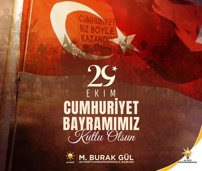 AK Parti Kahramanmaraş İl Başkanı M.Burak Gül, 29 Ekim Cumhuriyet Bayramı dolayısıyla yayımladığı kutlama mesajında, Cumhuriyet'in 102.Kuruluş yıl dönümünü büyük bir gurur ve heyecanla karşıladıklarını belirtti; özellikle birlik, beraberlik ve milli iradeye vurgu yaptı.