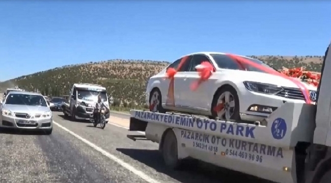 Çekiciyi gören gelin ise büyük bir şaşkınlık yaşadı. Süslenen gelin arabası çekicinin üzerine yüklendi. Gelin arabasının yüklü olduğu çekici, konvoyun en önüne geçerek diğer araçlarla birlikte kornalar eşliğinde şehir turu attı. Olayın kurgu olduğunu öğrenen gelinin şaşkınlığı yerini sevince bıraktı.