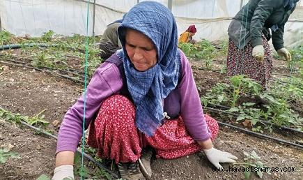 Tarım işçisi kadınlar, seraların içerisinde bir yandan salatalık hasadı yaparken diğer yandan domates fidelerine bakım yaparak, hummalı bir çalışma yürütüyor.