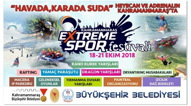 Kahramanmaraş’ta 18-21 Ekim 2018 tarihleri arasında gerçekleştirilecek Ekstrem Spor Festivali, Rafting, Yamaç Paraşütü, Kano Kürek Yarışları, Dragon yarışları, Oryantring Müsabakaları, 22 Oyunlu Macera Parkı Yarışları, Tırmanma Duvar Yarışları, Paintbal organizasyonunu kapsıyor.