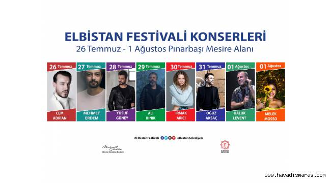 26 Temmuz’da Cem Adrian’la başlayacak Elbistan Festivali’nde Mehmet Erdem, Yusuf Güney, Ali Kınık, Irmak Arıcı, Oğuz Aksaç ve Haluk Levent sahne alacak.