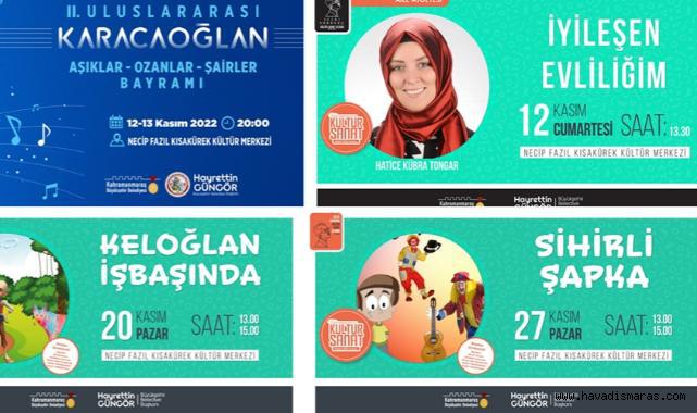 Kültür sanat etkinlikleri kapsamında Kasım ayında çeşitli konserler de Kahramanmaraşlılarla buluşacak. 12 ve 13 Ekim tarihlerinde 2. Uluslararası Karacaoğlan Âşıklar-Ozanlar-Şairler Bayramı temalı konser etkinliği gerçekleştirilecek. Necip Fazıl Kısakürek Kültür Merkezi’nde düzenlenecek etkinlik saat 20.00’da başlayacak. 24 Kasım Perşembe günü ise Klasik Türk Müziği Sanatçısı Dilek Türkan, Mehmet Akif Ersoy Kültür Merkezi’nde sahne alacak. Birbirinden güzel eserlerin seslendirileceği konser, saat 19.00’da başlayacak.