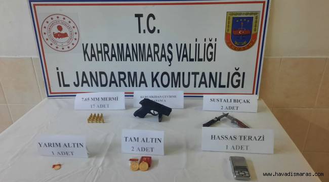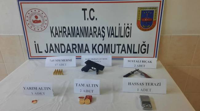Jandarma ekiplerince araç içerisinde yapılan aramada ise, 2 adet cumhuriyet altını, 1 adet yarım altın, 2 adet sustalı bıçak, 1 adet kurusıkıdan çevirme tabanca, 17 adet 7.62 mm fişek ve araç içerisinde bulunan hassas teraziye el konuldu.