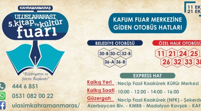 Kahramanmaraş Büyükşehir Belediyesi Ulaşım Hizmetleri Dairesi Başkanlığı’ndan yapılan yazılı açıklamada: “Uluslararası Kahramanmaraş 5. Kitap ve Kültür Fuarı süresince halkımızın fuara rahat ulaşımını sağlamak amacıyla 5 adet Belediye Otobüs hattı, 8 adette özel halk otobüsü 4 tane de Ekspres hat olmak üzere toplamda 17 hatla hizmet verilecektir. Uluslararası Kahramanmaraş 5. Kitap ve Kültür Fuarı’na gitmek isteyen vatandaşlarımız Belediye otobüslerimizden 30-B, 30-C, 32-B, 36-A ve 36-B ile, Özel halk Otobüslerinden 11, 21, 24, 25, 26, 32, 33 ve 38 numaralı hatlarla ulaşabilirler. Ayrıca Necip Fazıl Kısakürek Kültür Merkezi önünden başlamak üzere Şekerdere, Azerbaycan Bulvarı, Kahramanmaraş Büyükşehir Belediyesi Karşısı, Madalyalı kavşak ve Kahramanmaraş Fuar Merkezi güzergahından her gün 10.00, 12.00, 14.00 ve 16.00 saatlerinde hareket edecek Eskpres hatla da gidebilirler” denilerek bilgi verildi.