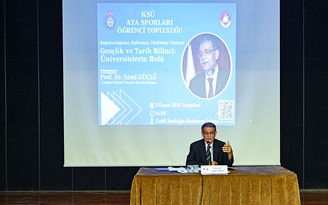 Kahramanmaraş Sütçü İmam Üniversitesi (KSÜ) Ata Sporları Öğrenci Topluluğu tarafından düzenlenen “Bağımsızlığımız, Hafızamız, Tarihimiz Yönüyle Gençlik ve Tarih Bilinci: Üniversitelerin Rolü” başlıklı konferans, 58. ve 59. Dönem Tarım ve Köy İşleri Bakanı, Anadolu Mektebi Kurucusu Prof. Dr. Sami Güçlü’nün katılımıyla gerçekleştirildi.