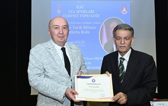 Programın sonunda öğrencilerin sorularını yanıtlayan Prof. Dr. Sami Güçlü’ye, KSÜ Prof. Dr. Alptekin Yasım tarafından teşekkür belgesi takdim edildi. Konferans, toplu fotoğraf çekimiyle sona erdi.