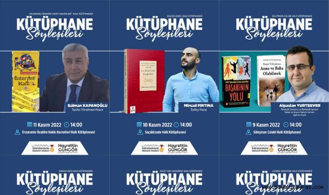 Kütüphane Söyleşileri; 9 Kasım Çarşamba günü saat 14.00’da Süleyman Çelebi Halk Kütüphanesi’nde Psikolojik Danışma ve Rehberlik Uzmanı Alpaslan Yurtsever’in ve Turgut Reis Halk Kütüphanesi’nde Şair – Yazar Ömer Yalçınova’nın katılımıyla gerçekleştirilecek etkinliklerle devam edecek. Aynı gün saat 17.30’da ise Tarihçi – Yazar Mehmet Işık, Necip Fazıl Kısakürek Halk Kütüphanesi’nde okurlarla bir araya gelecek.