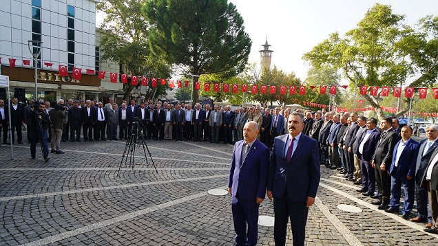 Muhtarları temsilen Ramazan Gürbak ve Mehmet Yanık Atatürk Anıtı’na çelenk sundular. Saygı duruşu ve İstiklal Marşı’nın okunmasının ardından Kanuni Mahallesi Muhtarı Resul Arslanhan günün anlam ve önemine ilişkin bir konuşma yaptı.