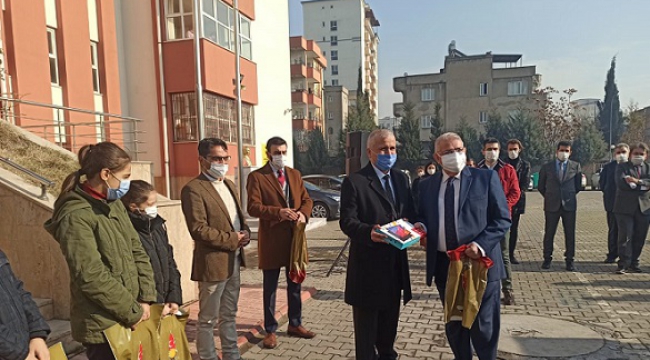 Okulların pandemi nedeniyle kapalı olması dolayısıyla 10 öğrenci ve velilerin katıldığı programda öğrencilere protokol tarafından tabletleri takdim edildi.