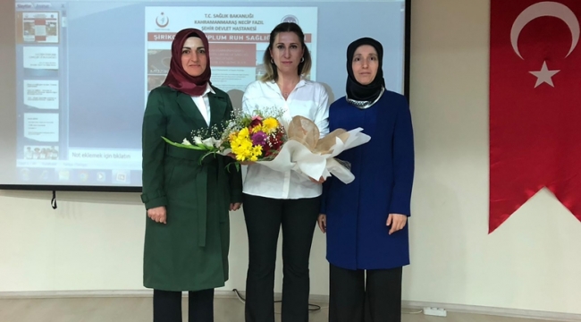 Programın sonunda AK Parti Kadın Kolları Başkanı Ayşe Cesur, Kahramanmaraş Büyükşehir Belediyesi Sağlık ve Sosyal Hizmetler Dairesi Başkanı Ayşe Taşkıran, Psikiyatri Uzmanı Dr. Özlem Altunören’e bir buket çiçek takdim ederek verdiği konferanstan dolayı teşekkür ettiler.