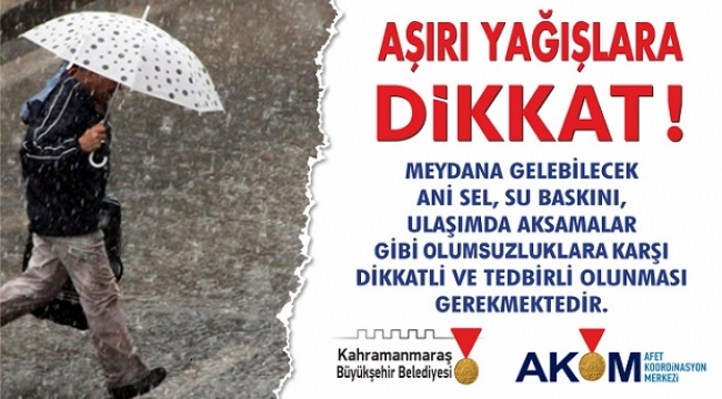 AKOM’dan yapılan açıklamada: “İlimizde meydana gelebilecek ani sel, su baskını, ulaşımda aksamalar gibi olumsuzluklara karşı dikkatli ve tedbirli olunması gerekmektedir. Meteoroloji kaynaklarından edinilen bilgilere göre bu geceden başlamak üzere Çarşamba gününe kadar Kahramanmaraş genelinde sağanak yağış olacağı tahmin edildiğinden, vatandaşlarımızın bu konuda duyarlı olmaları gerekmektedir.
