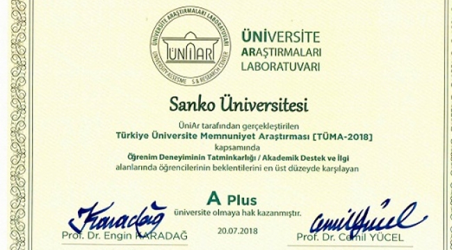 SANKO Üniversitesi, Üniversite Araştırma Laboratuvarı (ÜniAr) tarafından gerçekleştirilen Türkiye Üniversite Memnuniyet Araştırması (TÜMA) 2018 sonuçlarına göre, Öğrenim Deneyiminin Tatminkârlığı / Akademik Destek ve İlgi Alanlarında Öğrencilerinin Beklentilerini En Üst Düzeyde Karşılayarak, A Plus Üniversite statüsünde değerlendirildi.
