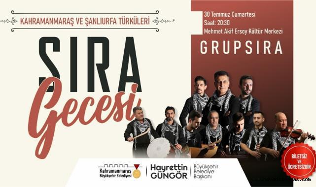 Kahramanmaraş Büyükşehir Belediyesi, kültür sanat etkinliklerini aralıksız sürdürüyor. Bu kapsamda, 30 Temmuz Cumartesi günü ‘Sıra Gecesi’ programı gerçekleştirilecek. Mehmet Akif Ersoy Kültür Merkezi’nde düzenlenecek etkinlik saat 20.30’da başlayacak.