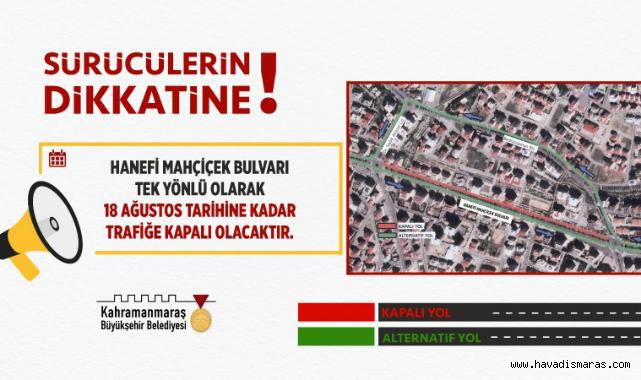 Kahramanmaraş Büyükşehir Belediyesi KASKİ Genel Müdürlüğü ekipleri, Binevler Caddesi Yenileme Projesi kapsamında Hanefi Mahçiçek Bulvarı’nda bir dizi altyapı çalışması gerçekleştiriyor. Alınan UKOME kararı doğrultusunda Hanefi Mahçiçek Bulvarı’nın 18 Ağustos tarihine kadar tek yönlü olarak trafiğe kapalı olacağı belirtildi.