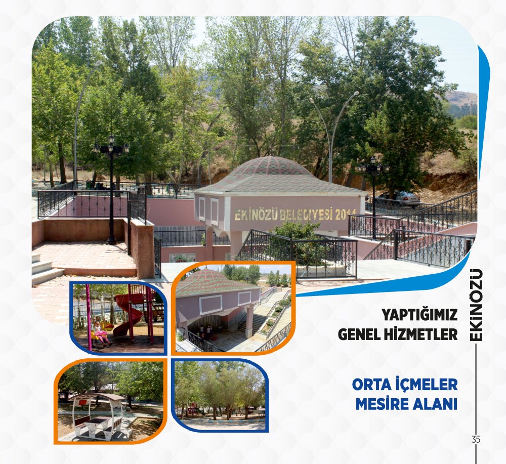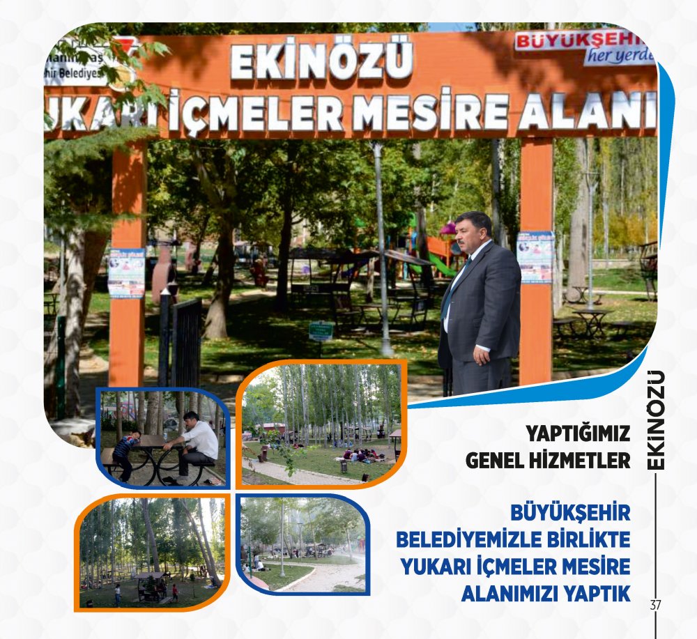 - Hemşerilerimize yakışacak bir hizmet bilinciyle Ekinözü Mesire alanımızı hizmete açtık. 13.000 m²’lik alanda; Restoran, wc, gölet, futbol sahası, basketbol sahası, 2 adet çocuk oyun alanı, kamelya, piknik masaları, banklar, yeşil alanlar yapılarak mesire alanın içinden geçen tahliye kanalı düzenlenerek Halkımızın hizmetine açtık.