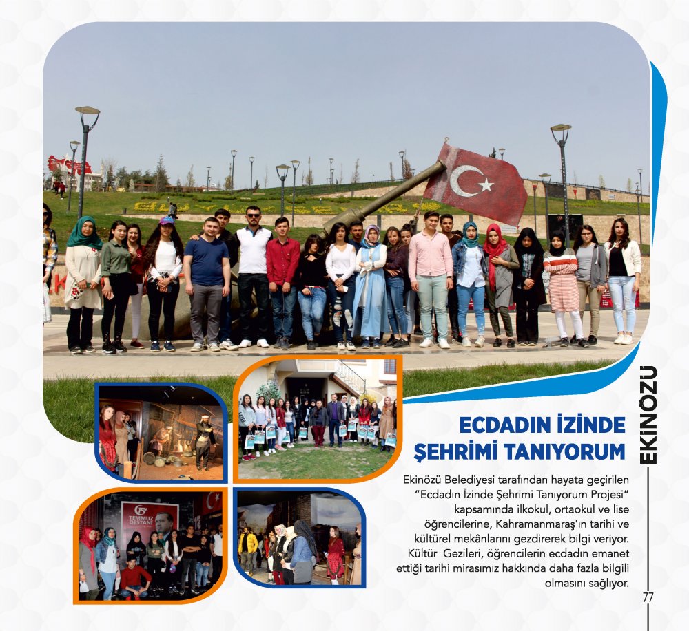 - “Ecdadın İzinde Şehrimi Tanıyorum Projesi” kapsamında ilkokul, ortaokul ve lise öğrencilerine, Kahramanmaraş’ın tarihi ve kültürel mekânlarını gezdirerek bilgilendirme yaptık. Kültür gezileriyle, öğrencilerin ecdadın emanet ettiği tarihi mirasımız hakkında daha fazla bilgi sahibi olmasını sağladık.