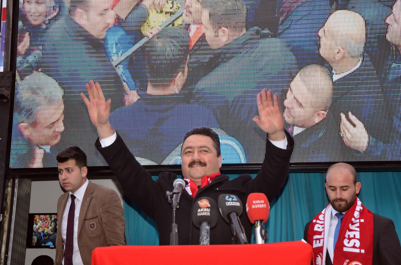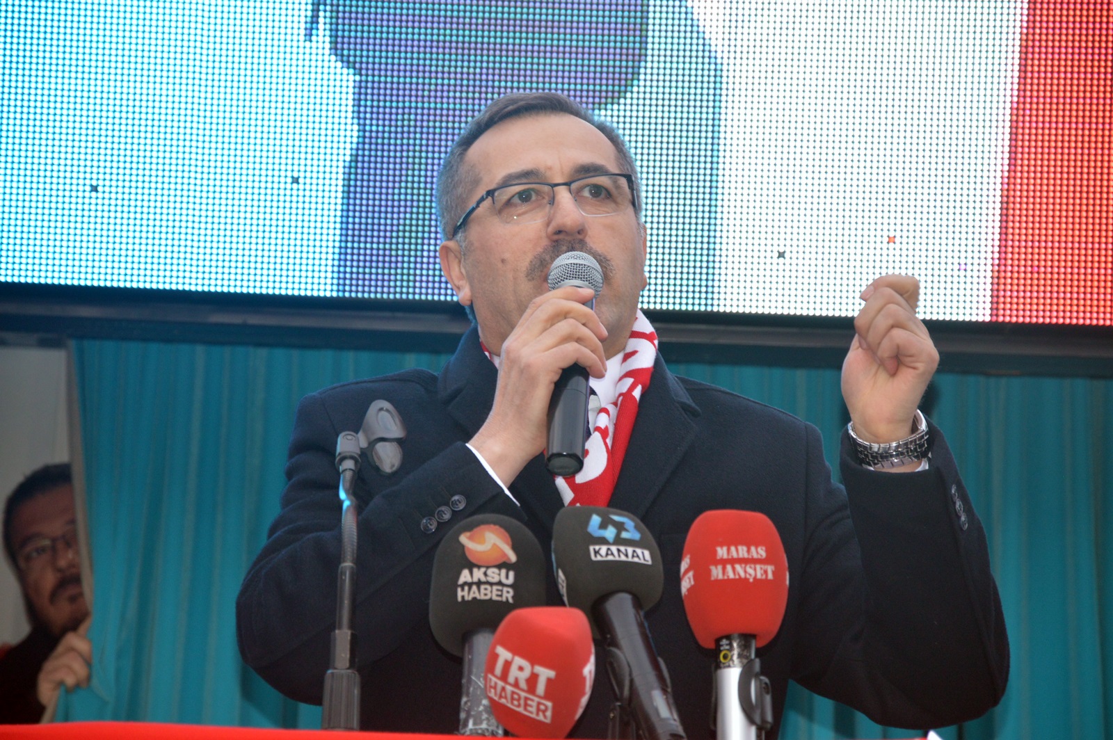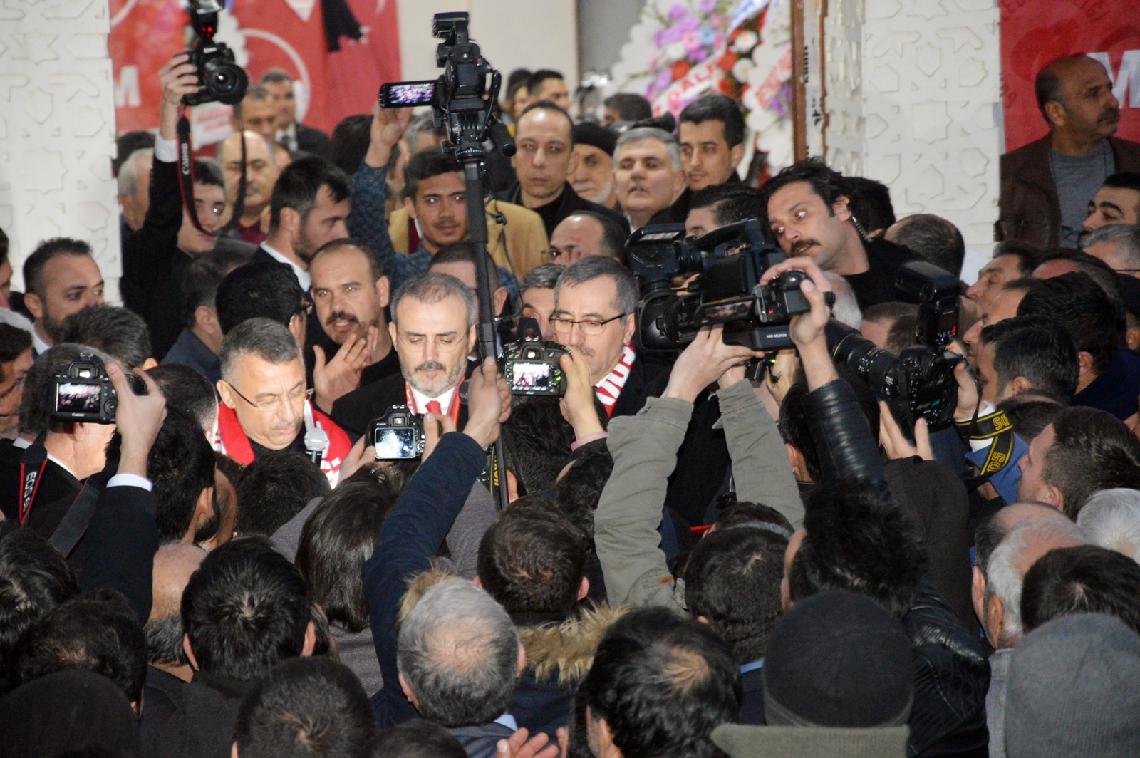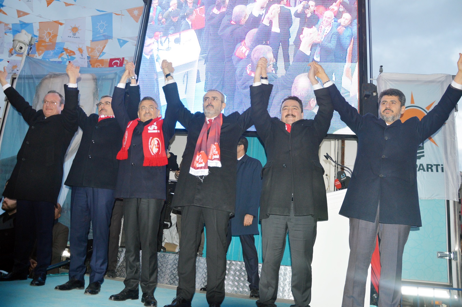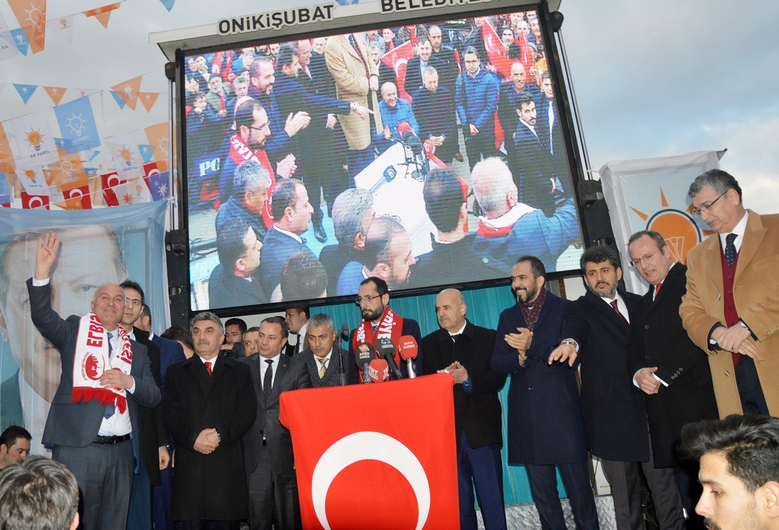 Cumhurbaşkanı Yardımcısı Fuat Oktay, konuşmasının ardından AK Parti Genel Başkan Yardımcısı Mahir Ünal, AK Parti Kahramanmaraş İl Başkanı Ömer Oruç Bilal Debgici, MHP Kahramanmaraş İl Başkanı Ertuğrul Doğan ve Cumhur İttifakı Kahramanmaraş Büyükşehir Belediye Başkan Adayı Hayrettin Güngör ve Cumhur İttifakı Elbistan Belediye Başkan Adayı Mehmet Gürbüz’le birlikte platformda partilileri selamladı.