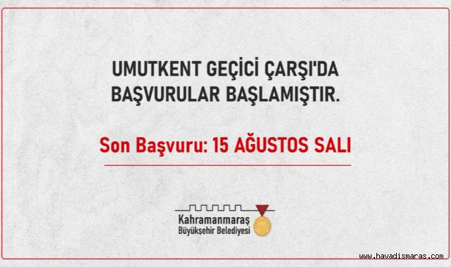 Büyükşehir Belediyesi Ana Hizmet Binası’nda bulunan Ticaret ve Sanayi Dönüşüm Ofisi’nden şahsen veya https://kahramanmaras.bel.tr/duyuru/2023/08/08/umutkent-carsisi-gecici-is-yeri-basvuru-ilani internet adresinden çevrimiçi yapılabilen başvurularda son gün 15 Ağustos Salı. Başvuru şartlarına ve detaylı bilgiye Büyükşehir Belediyesi’nin internet adresinde duyurular bölümünden ulaşılabiliyor.