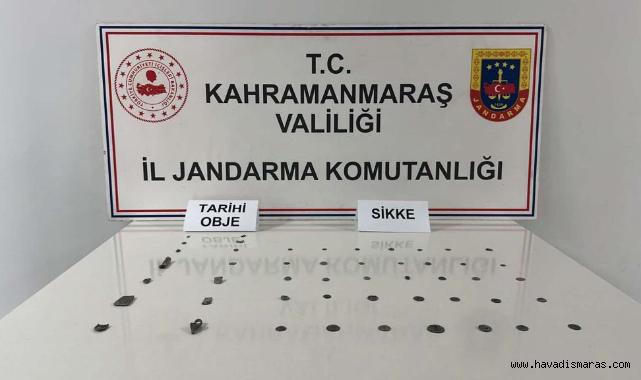 Edinilen bilgiye göre,  İl Jandarma Komutanlığı KOM Şube ve Türkoğlu İlçe Jandarma Komutanlığı ekipleri, ilçeye bağlı Ceceli Mahallesi bölgesinde Hususi bir otomobilde ‘Tarihi Eser Kaçakçılığı’ yapılacağı duyumu üzerine yapılan faaliyet sonucunda H.K’nin (22) üst aramasında Roma dönemine ait olduğu değerlendirilen (38) adet sikke, (12) adet tarihi obje ele geçirildi. Tarihi eserlere el koyan ekipler, H.K hakkında yasal işlem başlattı